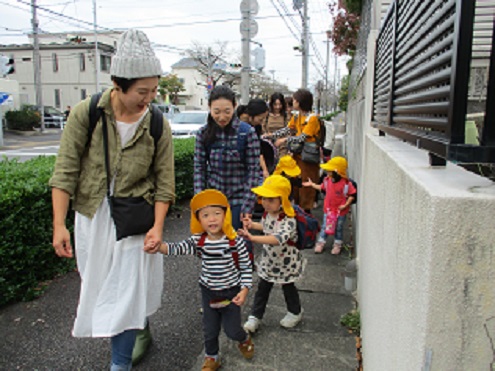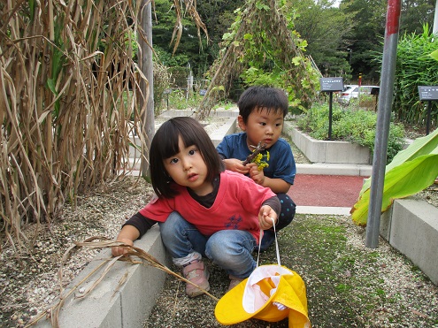 その後は大学構内を散策して薬草園で昼食をいただきました。にじぐみさんにとって長い道中、疲れて歩けなくなってしまう子も…。すると、「一緒にいこう!」と手をさしのべてくれるお友だちがいて、泣きべそ顔がパッと笑顔になり、また歩き始めた姿に子どもたちの絆を感じる場面もありました。