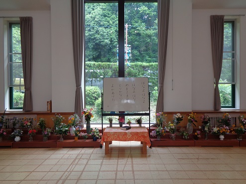 朝、子どもたちが少しずつ花を持ち寄ってくれ、礼拝を行う遊戯室がたくさんの花であふれました。