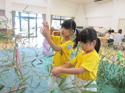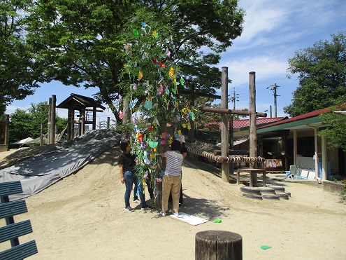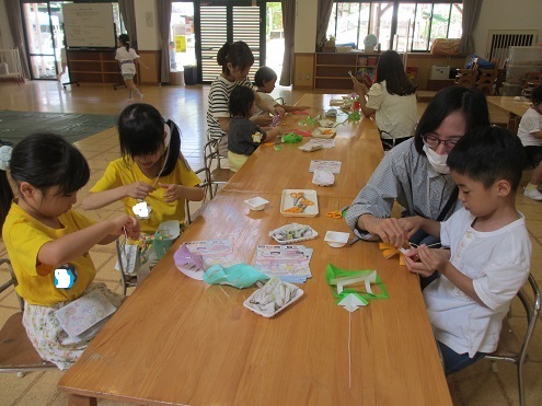お手伝いのおうちの方も参加して下さり、朝から笹飾りを作り、飾り付けをしたり、持ち帰り用の笹を子どもたちと一緒に切りに行きました♪そしてその後は、子どもたちが楽しみにしていたスイカのおやつを頂きました!ここ数年、コロナウイルスの流行により、スイカのおやつを食べていませんでしたが、今年は数年ぶりに食べる事ができました!