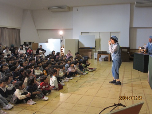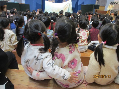 絵本を読んで、内容を知っている子どもたちもたくさんいました。途中ドキドキする場面もありましたが、周りのお友達と“ぎゅっ”としながら、真剣にみている子どもの姿もありました。笑いあり、迫力あり!の楽しい劇に、子どもたちも大喜びでした♪
