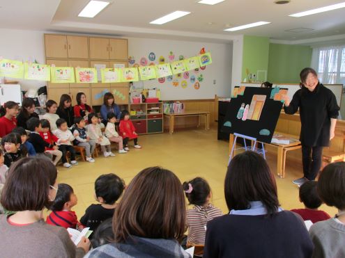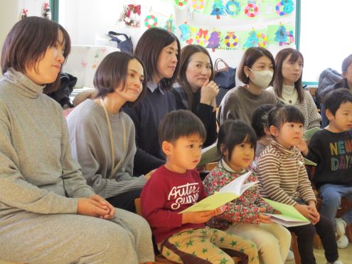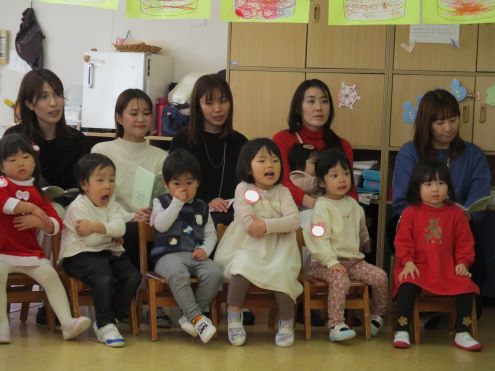 おうちの方と一緒にパネルシアターでイエス様のお誕生の物語を見ながら、讃美歌を歌いお祝いをしました。いつもにぎやかなにじぐみのお部屋もそのときは厳かな雰囲気に包まれました。初めて幼稚園で迎えるクリスマス。イエス様の誕生の喜びをみんなでで分かち合ったことは、きっと子どもたちの心に残る温かいひとときとなったことでしょう。