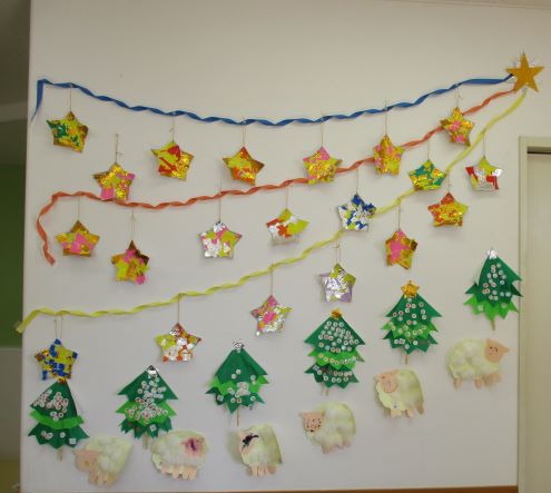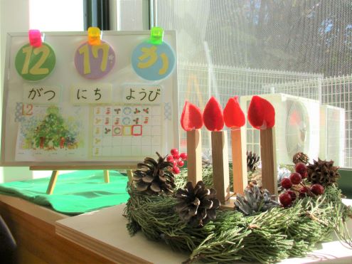 にじぐみのクランツにも4本目のろうそくがともされ、全員分のアドベントカレンダーを飾り、待ちに待ったクリスマス礼拝を行いました。