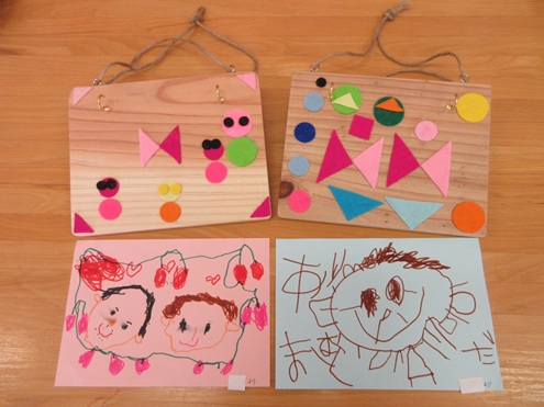 新しいことをやってみよう!と板のやすりがけに挑戦。ツルツルになるまで頑張りました。板の上には、○△□のフェルトを組み合わせ、構成画を行いました。カラフルな飾りつけになりました。