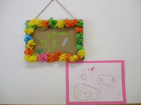 自分の好きな絵を画用紙いっぱいに描きました。園生活を楽しんでいる様子が絵からも伝わってきます。お花のフレームには写真を貼ったり、メモを貼ったりして使えるように。周りにはお花紙を丸めてかわいいお花を並べました。