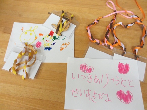 大好きな家族のために、ちょっと難しいことにも挑戦!三つ編みに初めて挑戦する子もいましたが、あきらめずに挑戦する姿はさすが年長さん。カードも思いを込めて書きました。